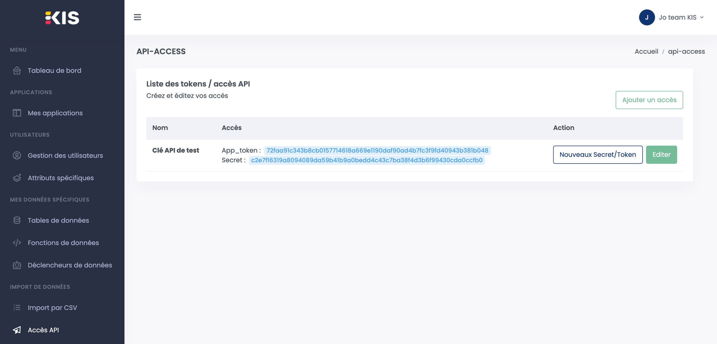 Avant de pouvoir exécuter des requêtes sur l'API KIS, vous devez au préalable avoir créé un accès API dans votre espace d'administration, page Accès API. Vous pourrez ensuite utiliser App_token et Secret pour vous connecter.