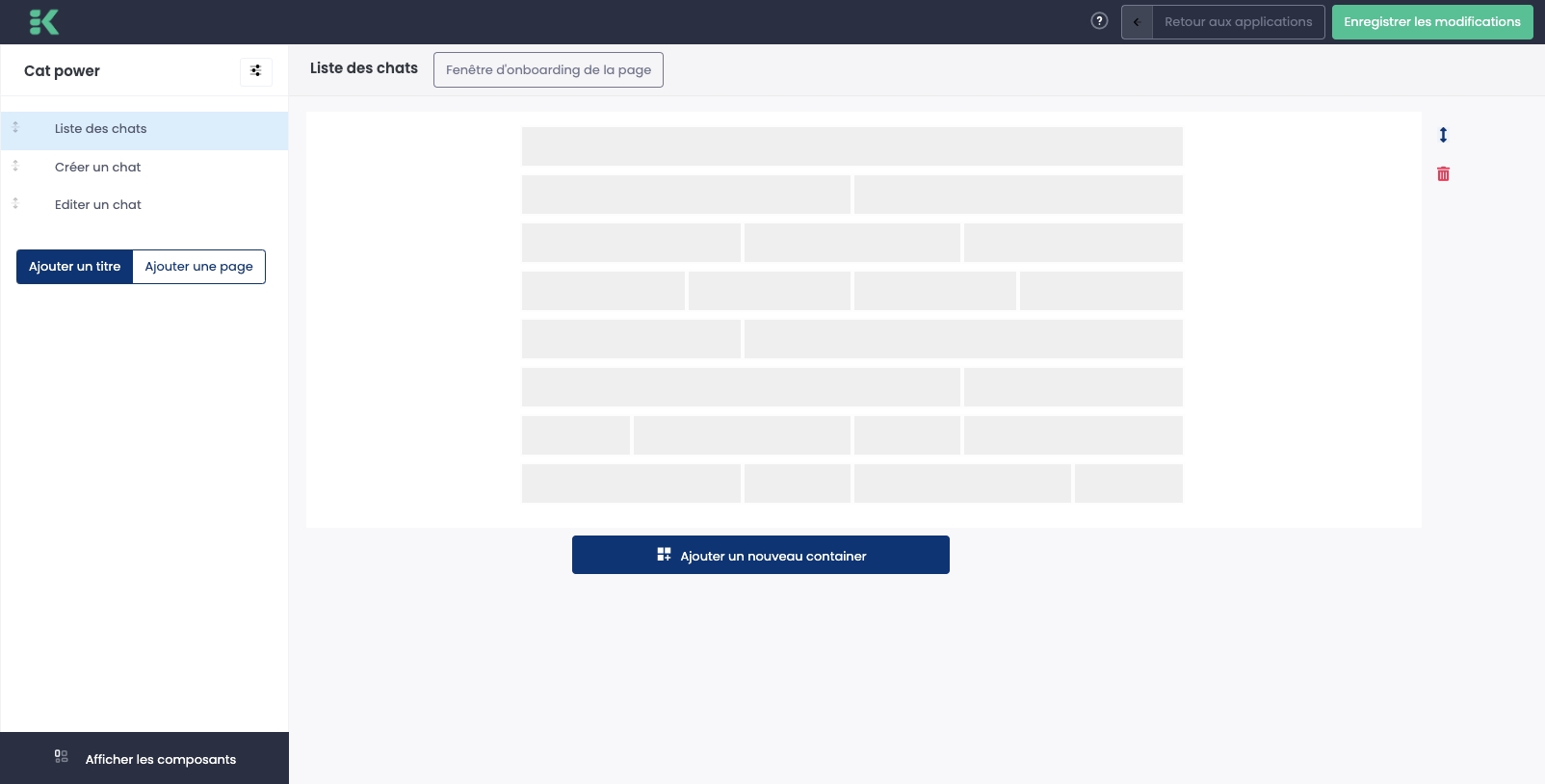 Retournons dans l'édition de notre application, sur la liste des pages et au niveau de la page Créer un chat.